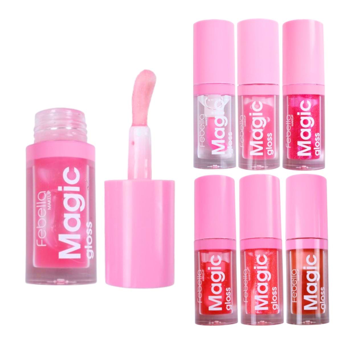 O Lip Gloss Magic Gloss Febella possui uma fórmula leve e não pegajosa, com 6 cores que incluem um tom incolor com efeito mágico que reage com o pH do lábio deixando coradinho; um rosa, um nude e um vermelho translúcidos; e dois tons com partículas de brilho: um vermelho e um rosa. Com um aplicador diferenciado e super anatômico em camurça, proporciona brilho e hidratação, deixando os lábios super macios. Pode ser usado sozinho ou sobre o batom, oferecendo versatilidade para qualquer ocasião, tornando-o perfeito para levar na bolsa.